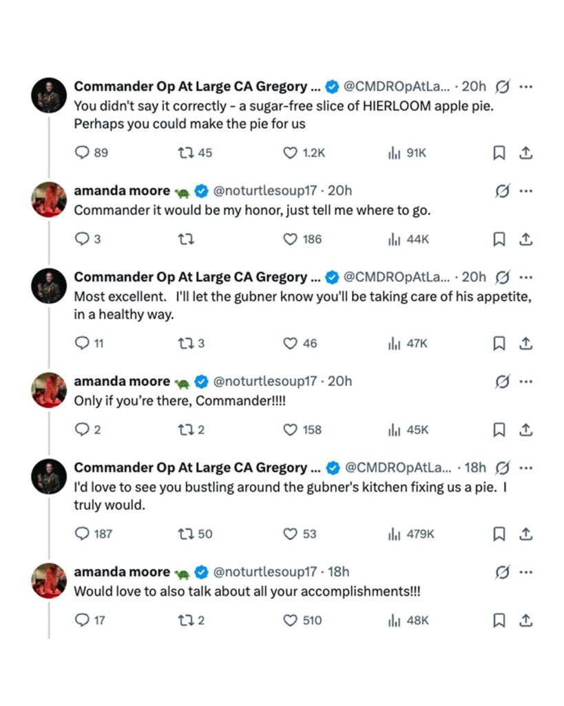 The exchange, captured in a screenshot shared widely on social media, involves Gregory K. Bovino — who uses the X handle @CMDROpAtLargeCA and styles himself “Commander Op At Large CA Gregory K. Bovino” — and freelance journalist Amanda Moore (@noturtlesoup17).