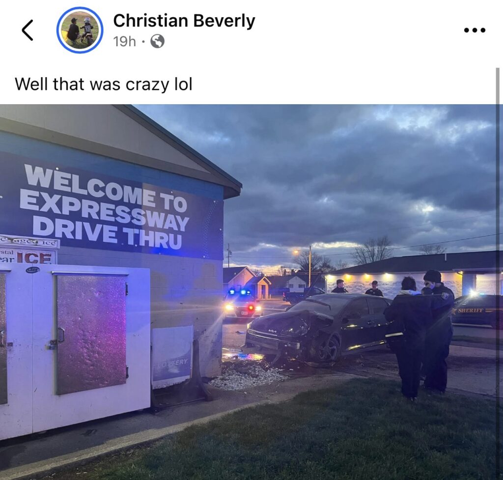 The owner of Expressway Drive-Thru, Deenna Harrington, reported the minor damage and provided insurance information from Ohio Mutual (policy BP0011674). Hill’s Towing was called to remove the vehicle.