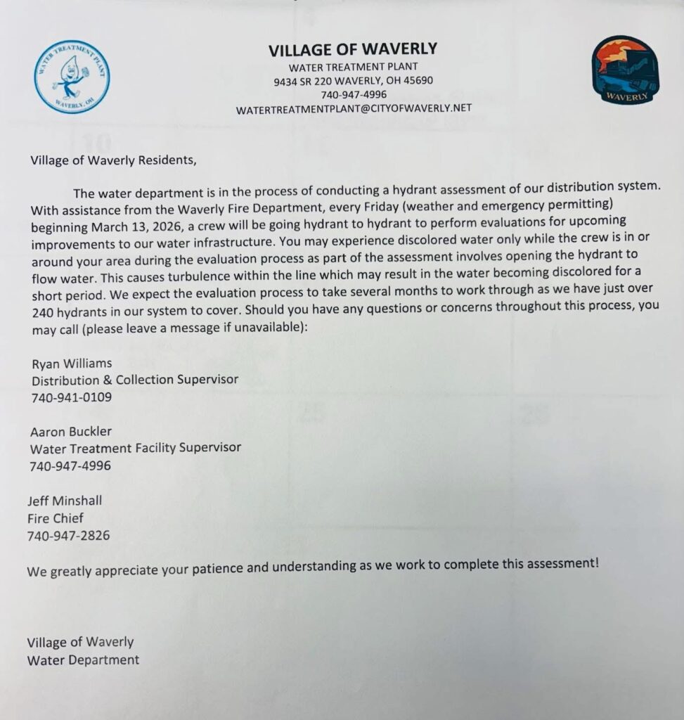 The Village of Waverly Water Department, in collaboration with the Fire Department, will commence a hydrant assessment on March 13, 2026, which may lead to temporary water discoloration for local residents. Conducted every Friday, weather and emergencies permitting, this evaluation of over 240 hydrants is part of ongoing efforts to assess and improve the water distribution system in Pike County, south central Ohio. The process involves opening hydrants to flow water, creating turbulence that can stir up sediments, but officials emphasize it is safe and should resolve quickly by running faucets.