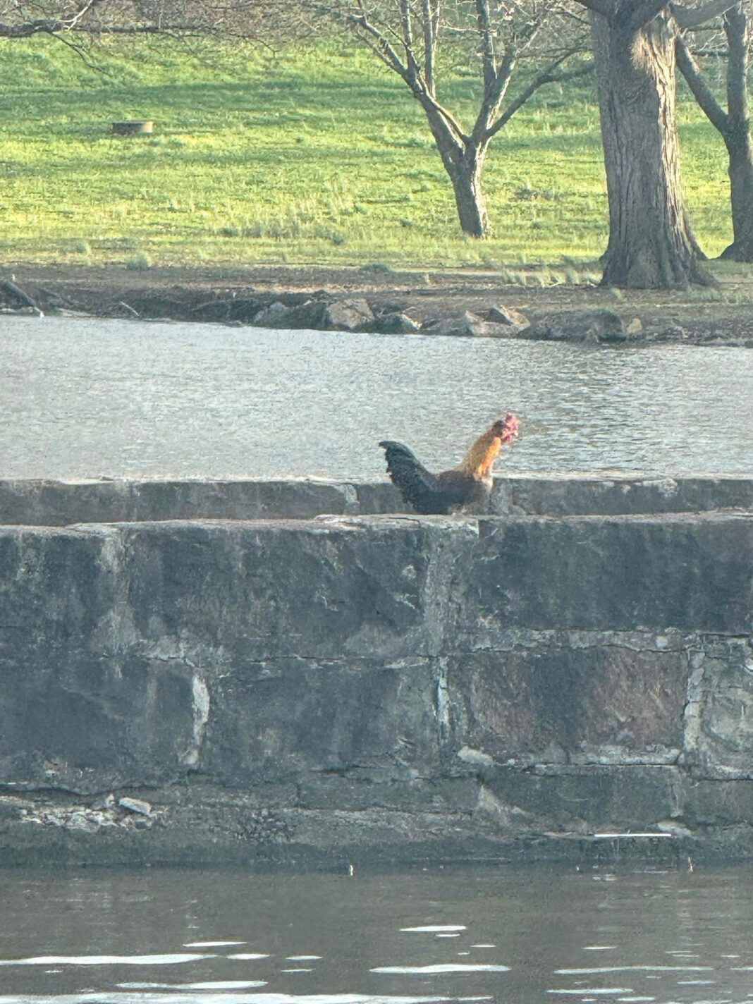 Chillicothe, Ohio – Local residents are chuckling after two roosters turned up unexpectedly at a Chillicothe park. Tommy Hammond, the original poster to Facebook, shared photos asking, “Anyone know why there is a chicken in the park?” He soon updated that there are actually two of them. The birds were spotted strutting along a stone wall by the water, grazing near geese and ducks, and even perching in a tree overnight and atop a car.